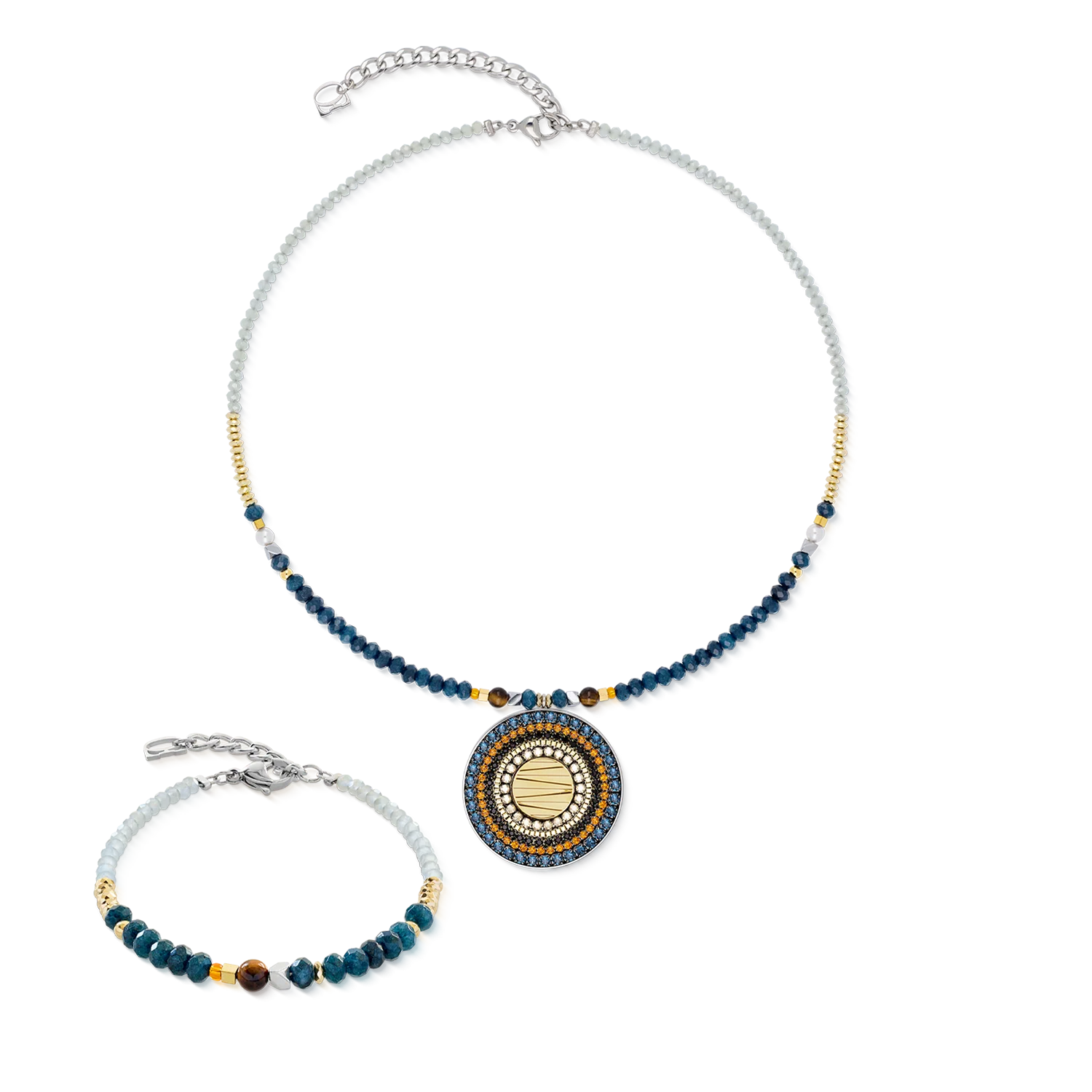 The Amulet Modern Future Motion Bicolor bracelet translates the bold design language of the necklace into a refined wrist piece. Faceted gemstones in cool blue shades meet gold and silver-toned elements, creating a modern bicolor contrast.