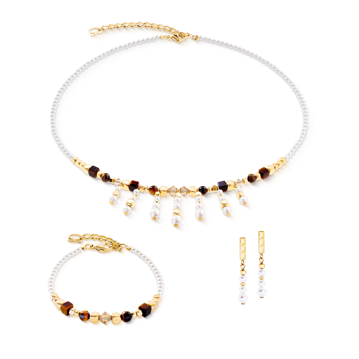 The Princess Sunray gold-brown bracelet reflects the warm gold-brown palette of the necklace in a balanced and wearable design. Tiger’s eye, Swarovski® crystals and softly rounded gold-finished hematite cubes create a harmonious visual rhythm.