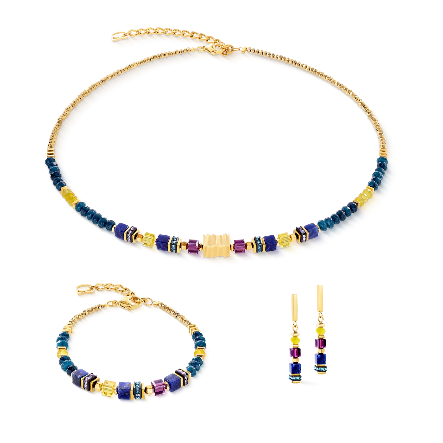 The Wave Precious Flow gold-energy bracelet features smooth gemstone cubes, including sodalite, combined with faceted dyed jade and Swarovski® crystals in vibrant colours.