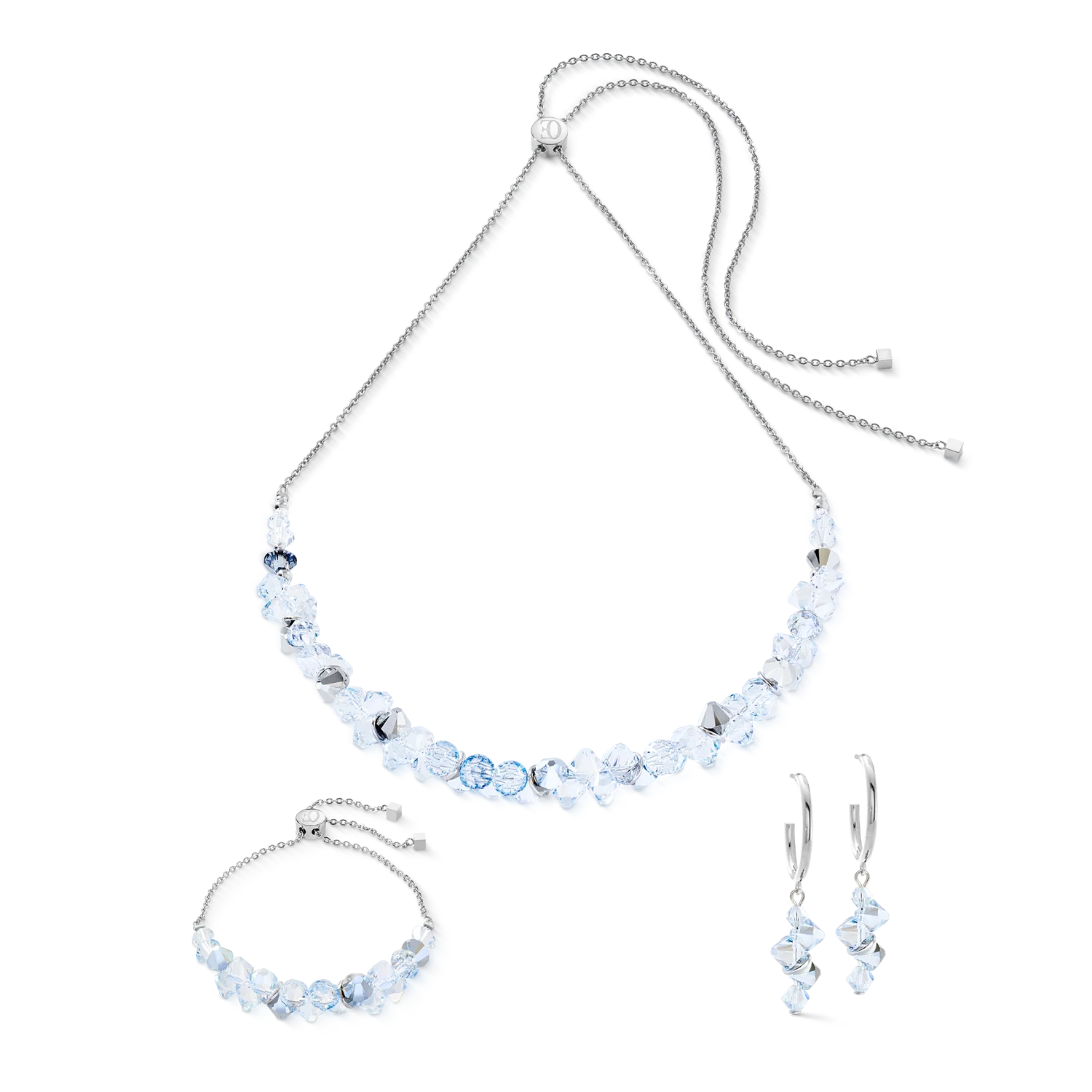 The dynamic arrangement of the crystals creates the signature “dancing” effect that defines the collection. The cool-toned stainless steel chain enhances the crystal clarity and provides a refined contrast between modern minimalism and luminous sparkle.