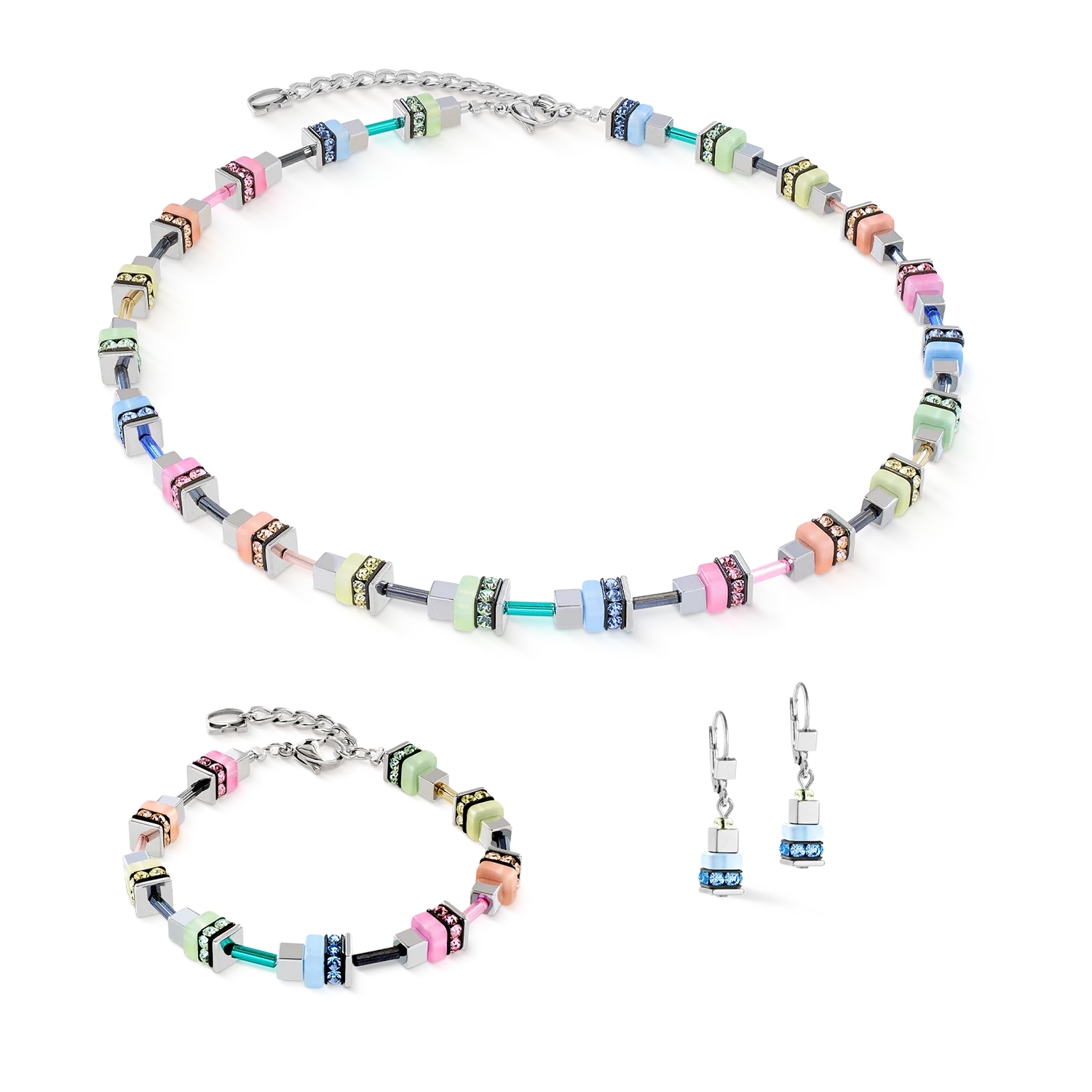 Soft and modern – the Fresh Sorbet Cube multicolor earrings reflect the pastel aesthetic of the collection in a sleek silhouette. Polaris cubes combine with sparkling rondelles and refined hematite elements.