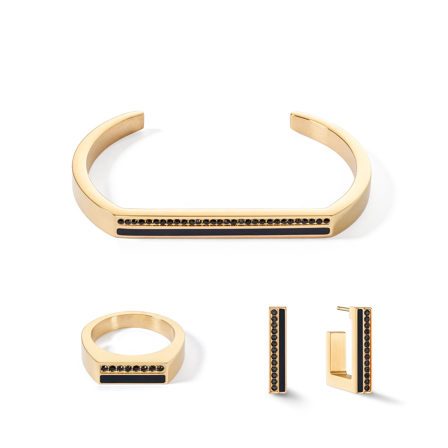 Are you ready for an eye-popping jewellery trend? Our square stainless steel hoops in gold and black are an absolute must for all the fashion-conscious out there. With an exciting combination of vibrant crystals and coordinating coloured stripes, these earrings will give your outfit a fresh, modern look. Matching bangle and rings available.