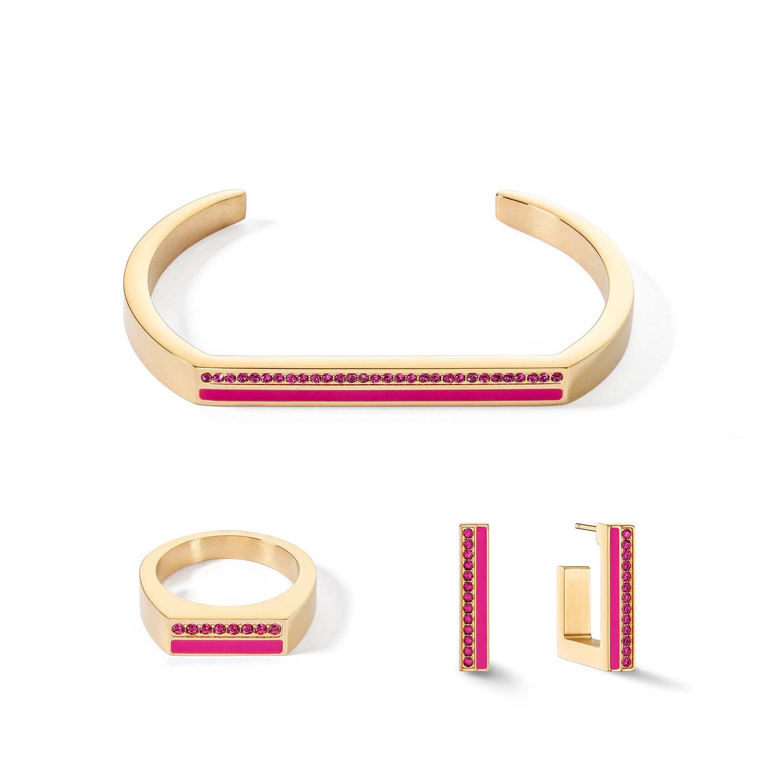 Are you ready for an eye-popping jewellery trend? Our square stainless steel hoops in gold and pink are an absolute must for all the fashion-conscious out there. With an exciting combination of vibrant crystals and coordinating coloured stripes, these earrings will give your outfit a fresh, modern look. Matching bangle and rings available.