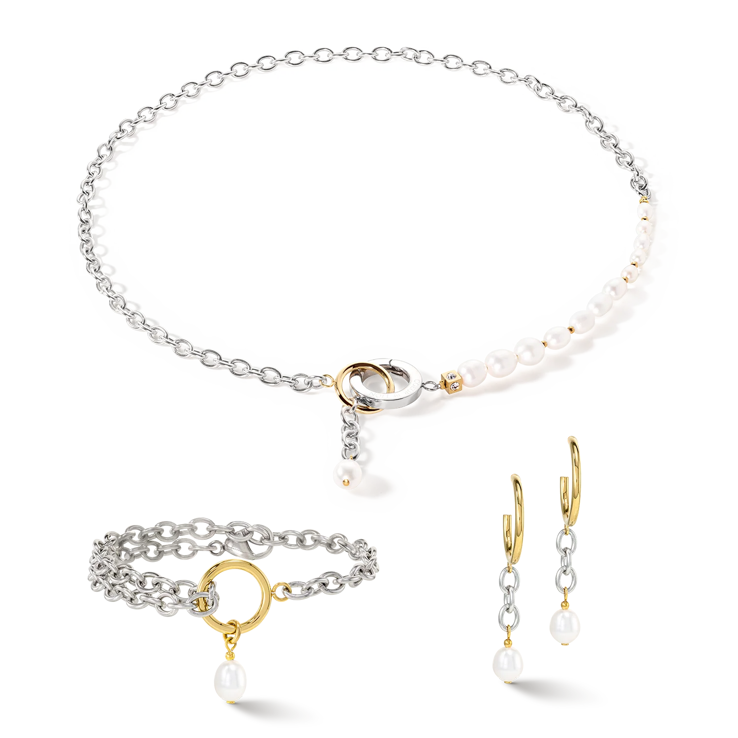What could be more beautiful than jewellery featuring genuine freshwater pearls? These elegant two-tone earrings impress with their combination of chunky chain and sophisticated pearls. A charming necklace and bracelet are available to match.