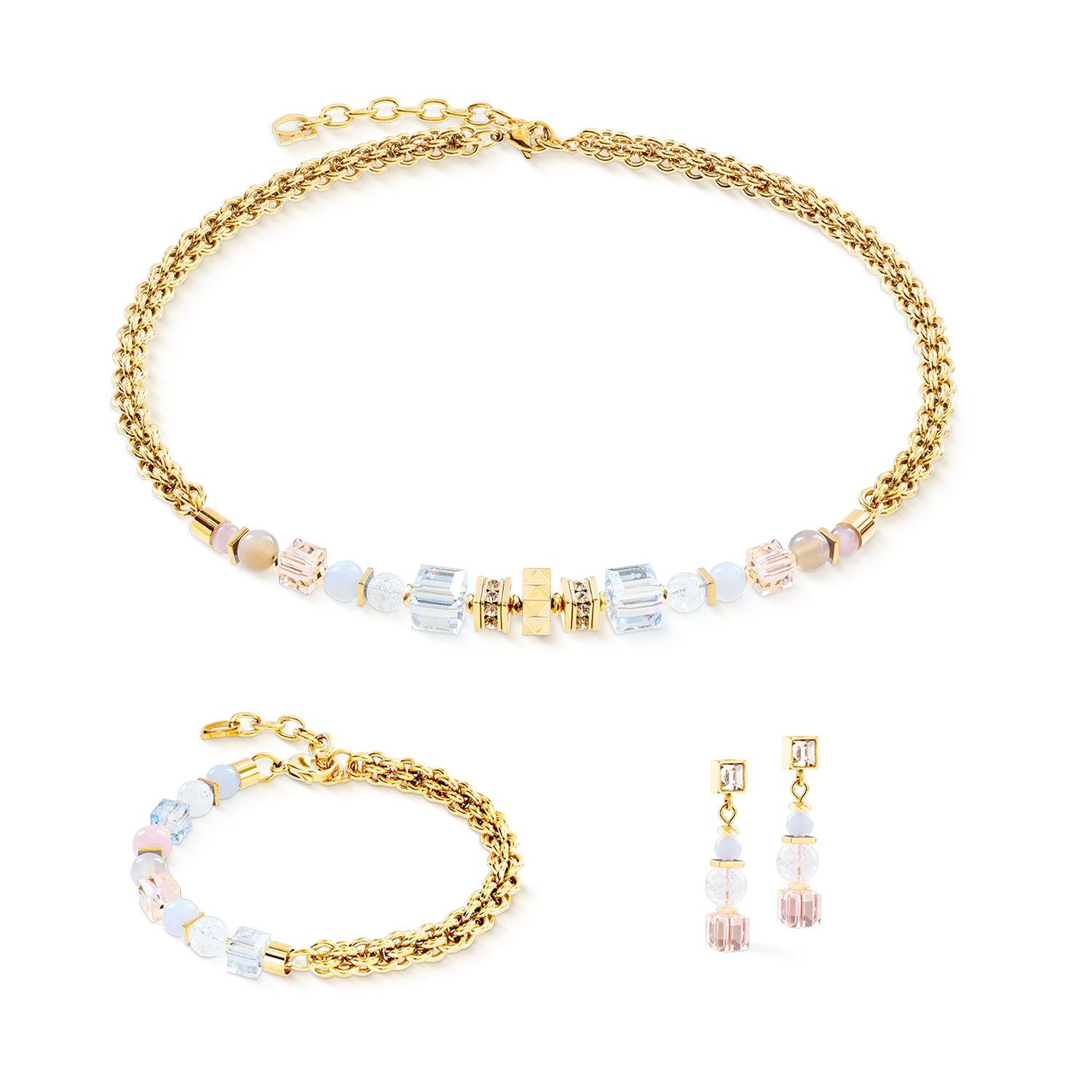 Gemstone cubes and delicate beads are complemented by faceted Swarovski® crystal cubes that reflect light beautifully. A central spike element adds architectural depth and a contemporary focal point.