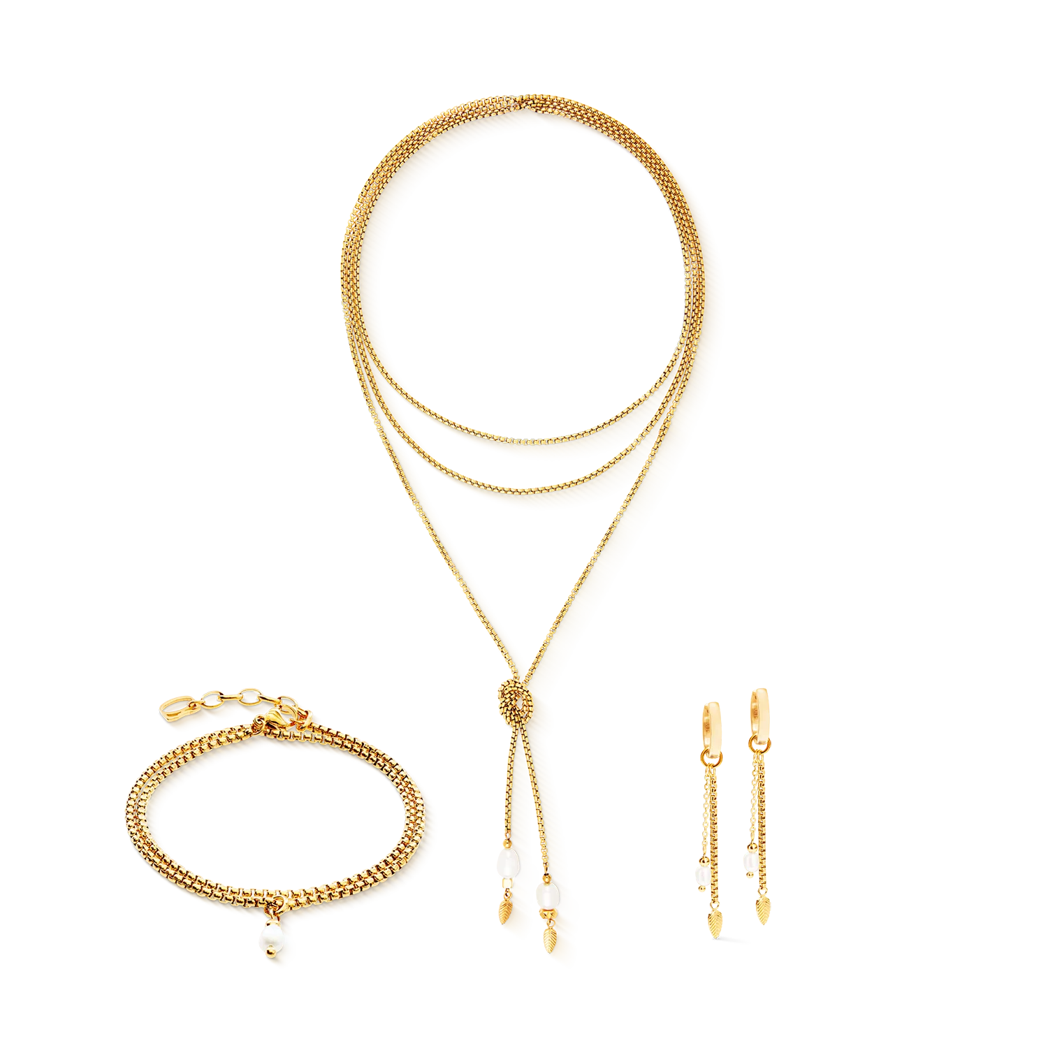 Versatility meets feminine elegance: the gold multiwear necklace combines flowing chain elements with a refined freshwater pearl and delicate leaf details. The decorative knot functions as both closure and defining design feature.