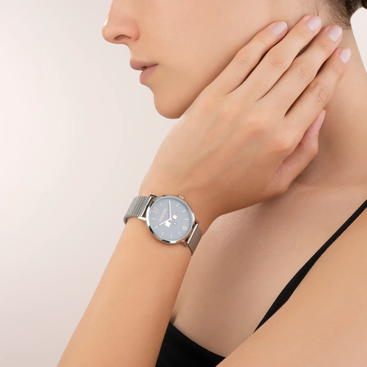 For female visionaries. These elegant watch features a high-quality casing and a Milanese strap made from stainless steel. The Cool Grey, sandblasted-effect dial makes a sophisticated statement with its delicate metal applications in silver, anthracite and rose gold. Worn alone or as part of an eye-catching combination with other COEUR DE LION jewellery, this puristic watch is well ahead of its time.